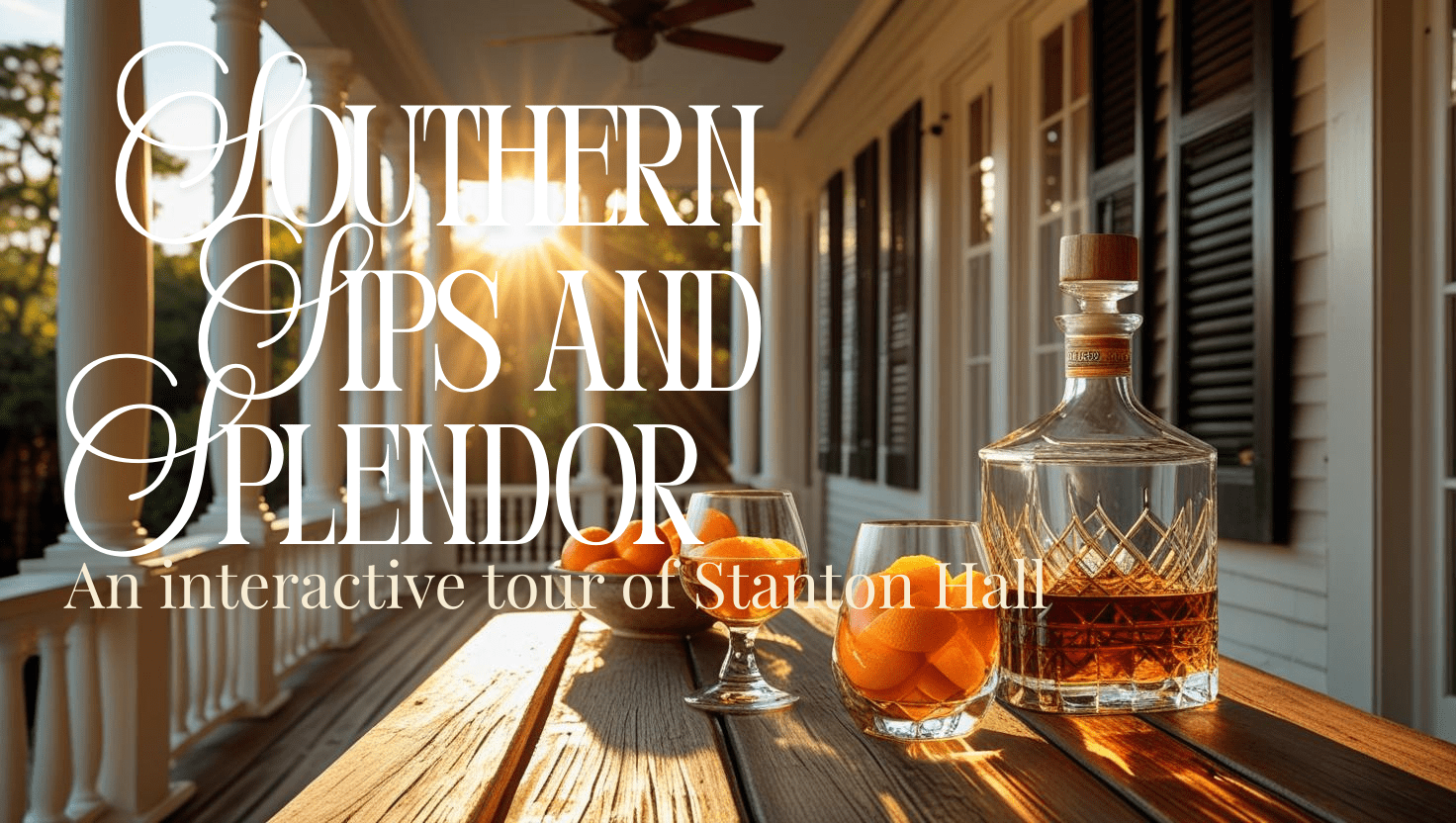 The night drifts toward the back porch, where cicadas hum in the twilight. Here, glasses are raised for a Bourbon tasting, each pour telling its own story of Southern craftsmanship. Laughter, music, and the scent of Sweet Olive linger in the air—an evening at Stanton Hall to remember.